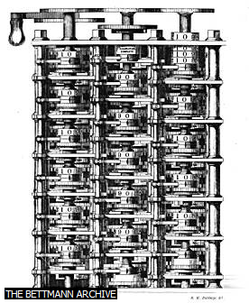 Considered by many to be a direct forerunner of the modern computer, the Difference Engine was able to compute mathematical tables. This woodcut shows a small portion of the ingenious machine, which was designed by Charles Babbage in the 1820s. Although the device did not have a memory, Babbage’s later idea for the Analytical Engine would have been a true, programmable computer if the technology of his time had been able to build it.