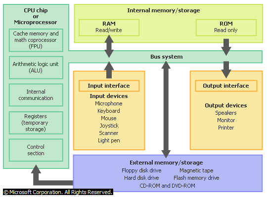 A typical computer system consists of a central processing unit (CPU), input devices, storage devices, and output devices. The CPU consists of an arithmetic/logic unit, registers, control section, and internal bus. The arithmetic/logic unit carries out arithmetical and logical operations. The registers store data and keep track of operations. The control unit regulates and controls various operations. The internal bus connects the units of the CPU with each other and with external components of the system. For most computers, the principal input devices are a keyboard and a mouse. Storage devices include hard disks, CD-ROM drives, and random access memory (RAM) chips. Output devices that display data include monitors and printers.