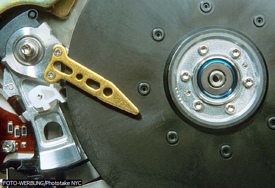The inside of a computer hard disk drive consists of four main components. The round disk platter is usually made of aluminum, glass, or ceramic and is coated with a magnetic media that contains all the data stored on the hard drive. The yellow armlike device that extends over the disk platter is known as the head arm and is the device that reads the information off of the disk platter. The head arm is attached to the head actuator, which controls the head arm. Not shown is the chassis which encases and holds all the hard disk drive components.