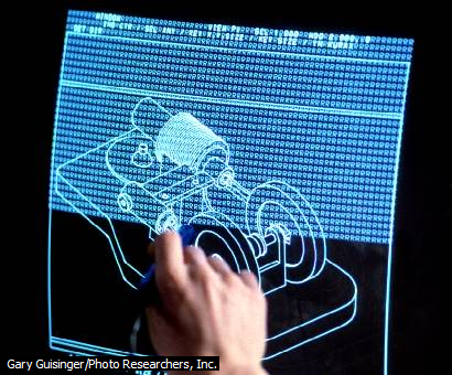 Light pens are electronic pointers that allow users to modify designs on-screen. The hand-held pointer contains sensors that send signals to the computer whenever light is recorded. The computer’s screen is not lit up all at once, but traced row-by-row by an electron beam sixty times every second. Because of this, the computer is able to determine the pen’s position by noting exactly when the pen detects the electron beam passing its tip. Light pens are often used in computer-aided design and computer-aided manufacture (CAD and CAM) technology because of the flexibility they provide. Here, an engineer uses a light pen to modify a technical drawing on a computer display screen.